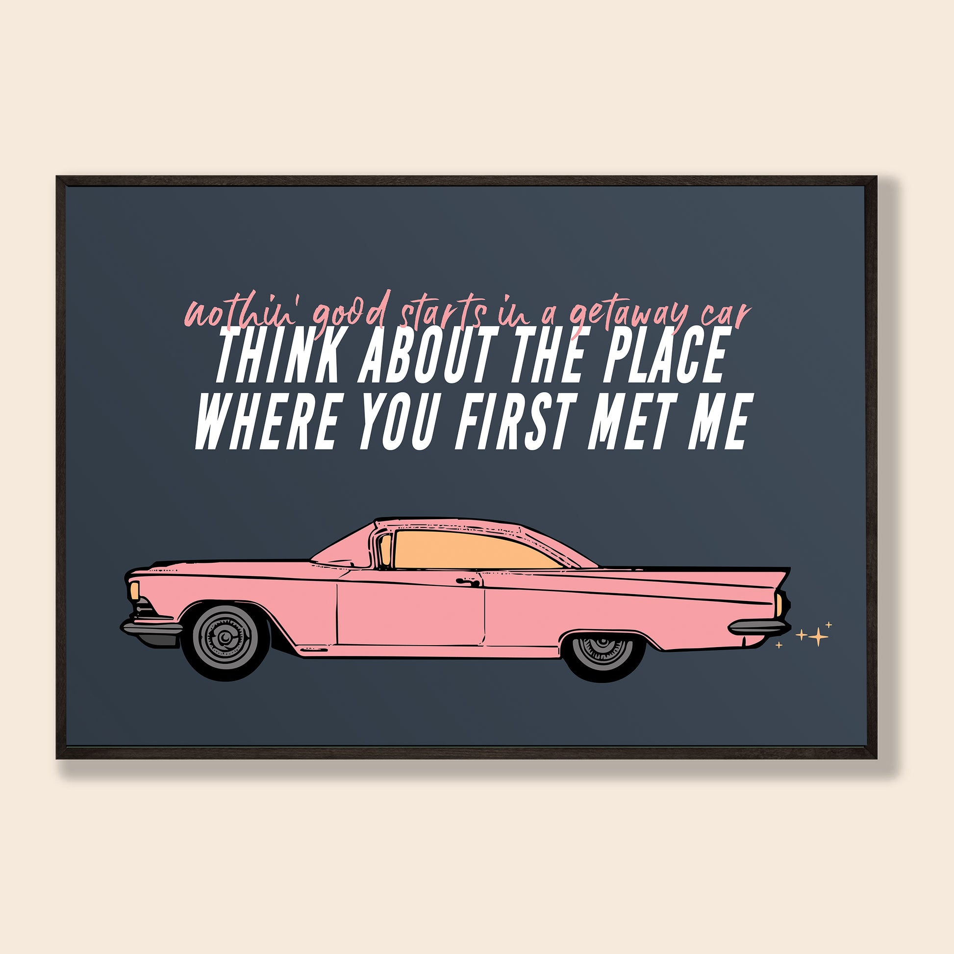 Cruise on into style with this cool Getaway Car Print! Inspired by Taylor Swift lyrics, this unique artwork is sure to turn heads with its eye-catching colours. Perfect for any Swiftie's home, this gorgeous print will add a stylish pop of personality wherever you hang it. Time to hit the road!